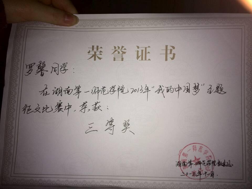 2013年湖南第一師范學(xué)院“我的中國夢”主題征文比賽中,羅馨榮獲此次比賽三等獎。羅馨表示通過這次比賽不僅鍛煉了自己的能力,同時讓她更加清晰的了解了自己。她希望自己今后能夠參加更多類似的比賽,并且取得更好的成績。
