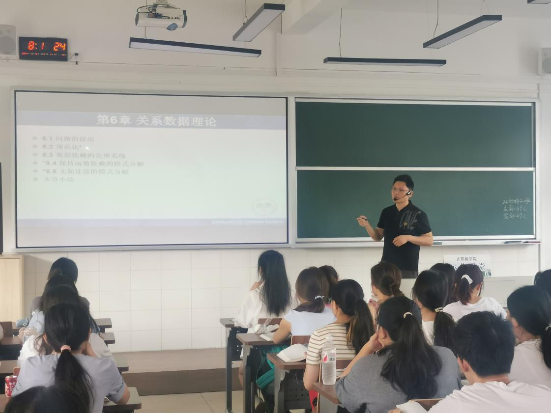 5月16日上午,林開彬在玉衡樓506為22計(jì)科2班的同學(xué)主講了《數(shù)據(jù)庫原理及應(yīng)用》課,內(nèi)容是關(guān)系數(shù)據(jù)理論中的函數(shù)依賴。林開彬利用思維導(dǎo)圖的形式回顧了數(shù)據(jù)庫完整性的相關(guān)內(nèi)容,為本節(jié)內(nèi)容的講授做了較好的鋪墊。他通過高校應(yīng)用開發(fā)中的實(shí)例引出關(guān)系數(shù)據(jù)理論的必要性,極大地激發(fā)了學(xué)生的學(xué)習(xí)興趣。整堂課上,林開彬教學(xué)的親和力使課堂氛圍輕松愉快,學(xué)生們的聽課效果較好。