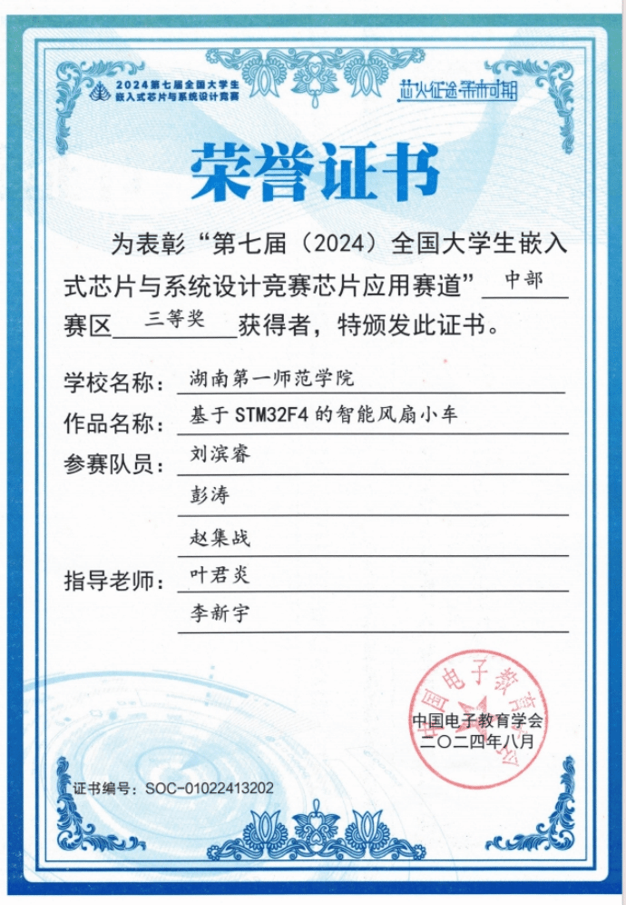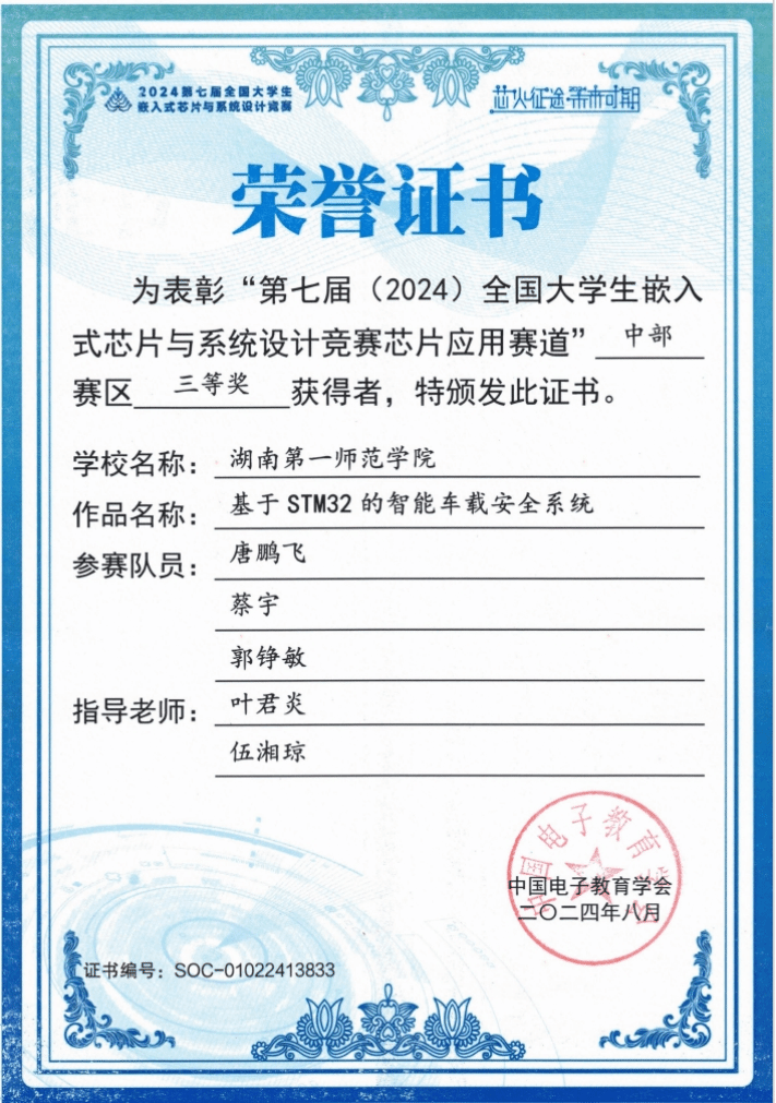 第七屆(2024)全國大學(xué)生嵌入式芯片與系統(tǒng)設(shè)計(jì)競賽圓滿收官。該競賽由中國電子學(xué)會(huì)主辦、東南大學(xué)承辦,是面向全國高校學(xué)生的權(quán)威賽事,已連續(xù) 4 年入選 “全國普通高校大學(xué)生競賽排行榜”。此次比賽競爭激烈,我院首次組隊(duì)參賽,在指導(dǎo)老師葉君炎的精心指導(dǎo)下,參賽學(xué)生憑借扎實(shí)專業(yè)知識(shí)與拼搏精神,于中部賽區(qū)榮獲三等獎(jiǎng) 3 項(xiàng)。