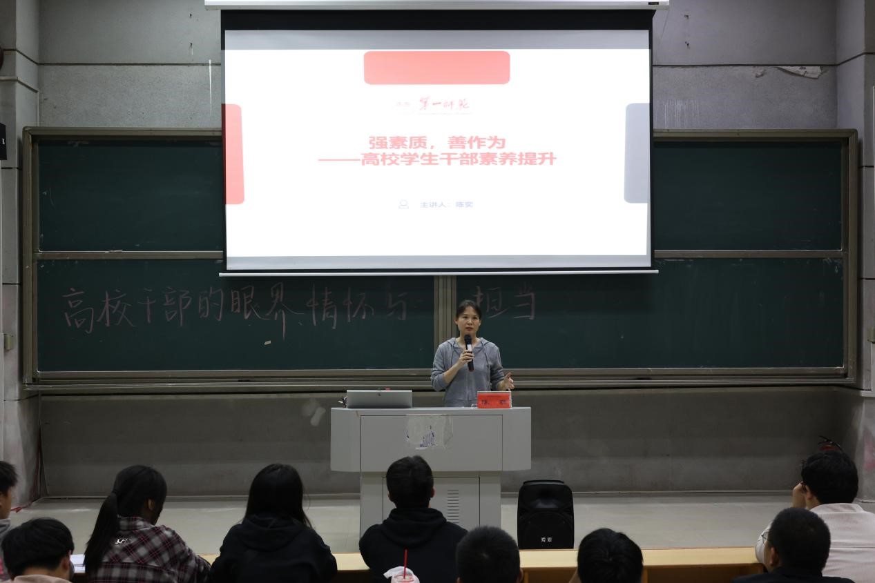 陳奕以學(xué)生干部應(yīng)具備的素質(zhì)為切入點(diǎn),詳細(xì)闡述了學(xué)生干部應(yīng)具備的素養(yǎng)。她指出,作為學(xué)生干部,不僅要具備扎實(shí)的專業(yè)技能,更要有廣闊的視野和深厚的情懷,要勇于擔(dān)當(dāng),積極作為。她強(qiáng)調(diào),學(xué)生干部要有積極向上、大度寬容的心態(tài),理性分析、協(xié)調(diào)處理的能力以及勇于擔(dān)責(zé)、善于擔(dān)責(zé)的魄力,她還強(qiáng)調(diào)了做人做事要為人正直、注重誠信、善于溝通、學(xué)會(huì)尊重,要努力成為堪當(dāng)民族復(fù)興重任的時(shí)代新人。