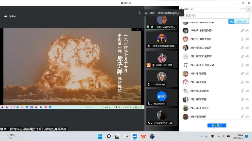 此次活動(dòng)以線(xiàn)上形式進(jìn)行,13日晚19點(diǎn)主持人一段昂揚(yáng)的開(kāi)場(chǎng)白過(guò)后,宣講活動(dòng)拉開(kāi)了帷幕。圍繞“黨旗高高揚(yáng),紅色核工業(yè)”的主題,豐富的紅色‘核’知識(shí)以多樣的形式呈現(xiàn)在同學(xué)們眼前。線(xiàn)上會(huì)議共享的,遠(yuǎn)不止核工業(yè)知識(shí),還有家國(guó)情懷以及要用心發(fā)現(xiàn)生活中美好事物的精神。