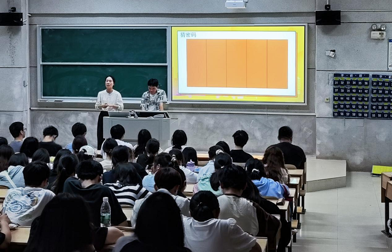 袁莎邀請我院大三密碼班的學(xué)生現(xiàn)身說法,以“猜數(shù)字”游戲入題,幫助與會學(xué)生了解密碼的概念,闡述了國家對密碼行業(yè)的政策支撐和行業(yè)薪資報(bào)酬,重點(diǎn)介紹了密碼班學(xué)生的實(shí)習(xí)情況。
